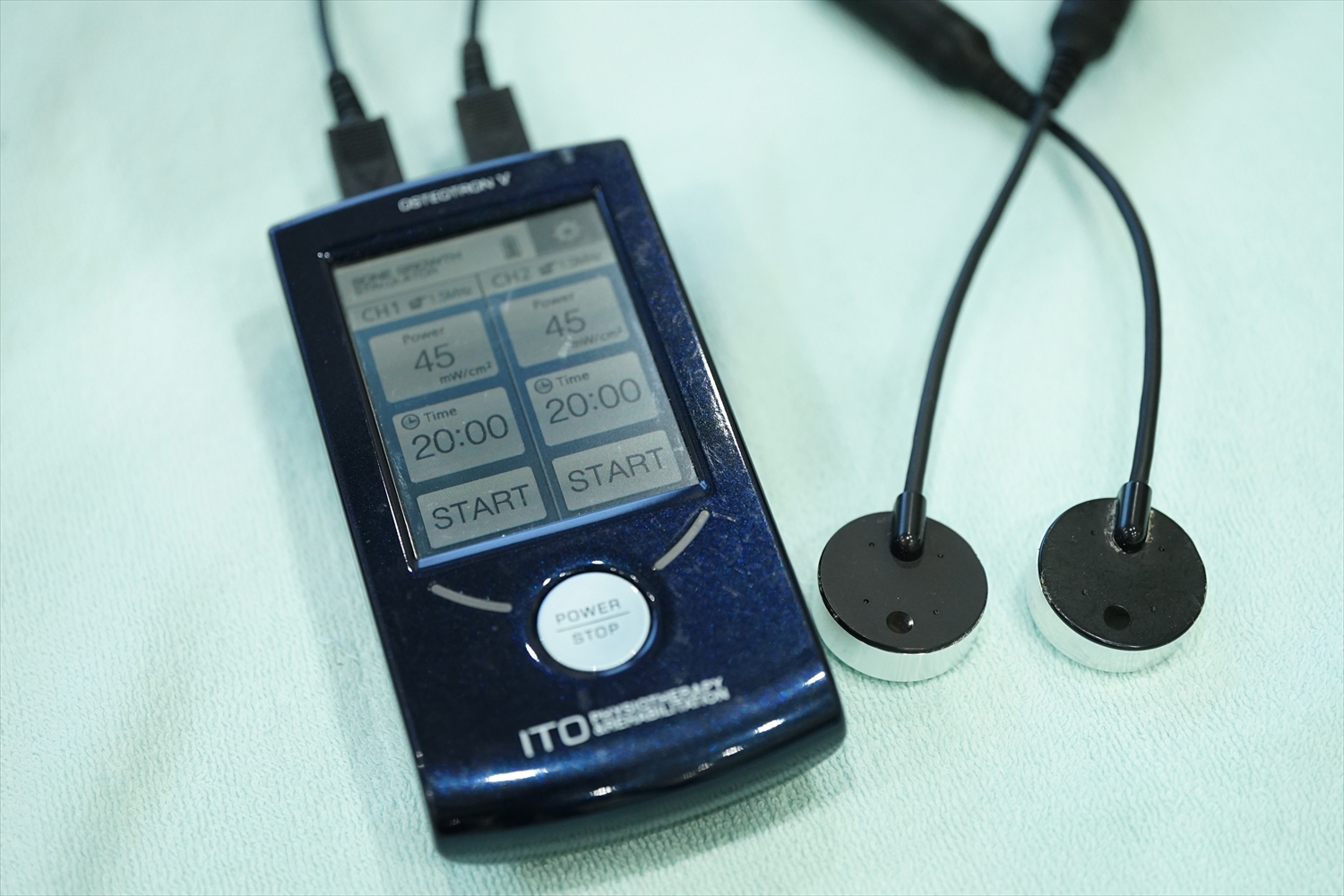 低出力超音波パルスという微弱な超音波を患部に断続的にあてることで、骨が融合するまでの期間を約40%短縮することができます。軟部組織損傷(靭帯、筋肉、腱、軟骨など)においても、疼痛抑制効果や組織の修復を促進する効果が認められています。