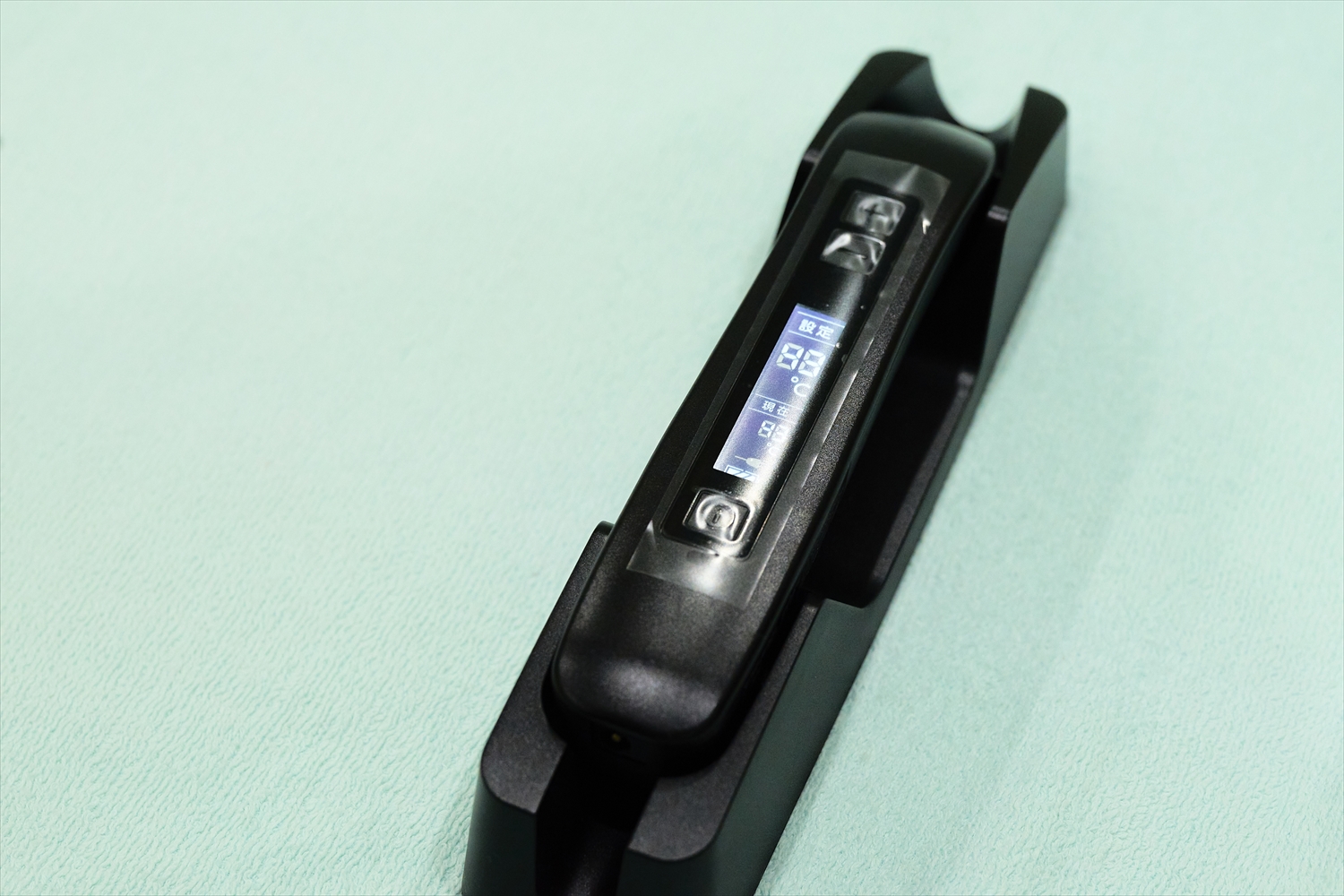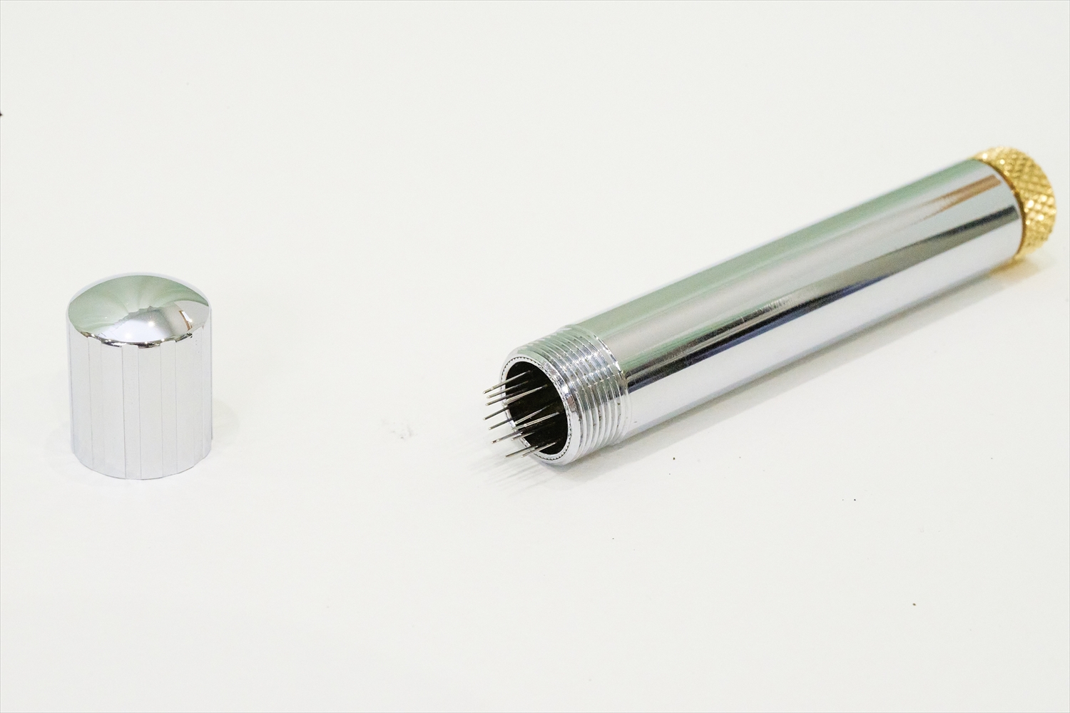 筒の中に16本の先の丸い鍼がついていて、鍼の奥にバネが入っているため刺さりません。頭皮の血流を促進させたりするときに使います。