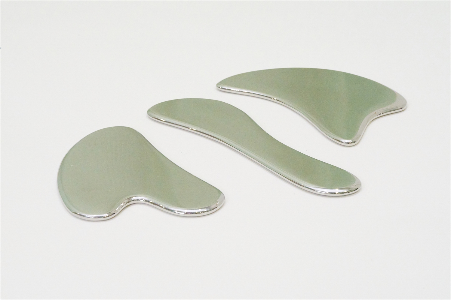 専用のかっさプレートを使って皮膚の経絡や反射区を擦って刺激することで、毛細血管に圧を加えて血液の毒を皮膚表面に押し出し、経絡の流れを良くする道具。