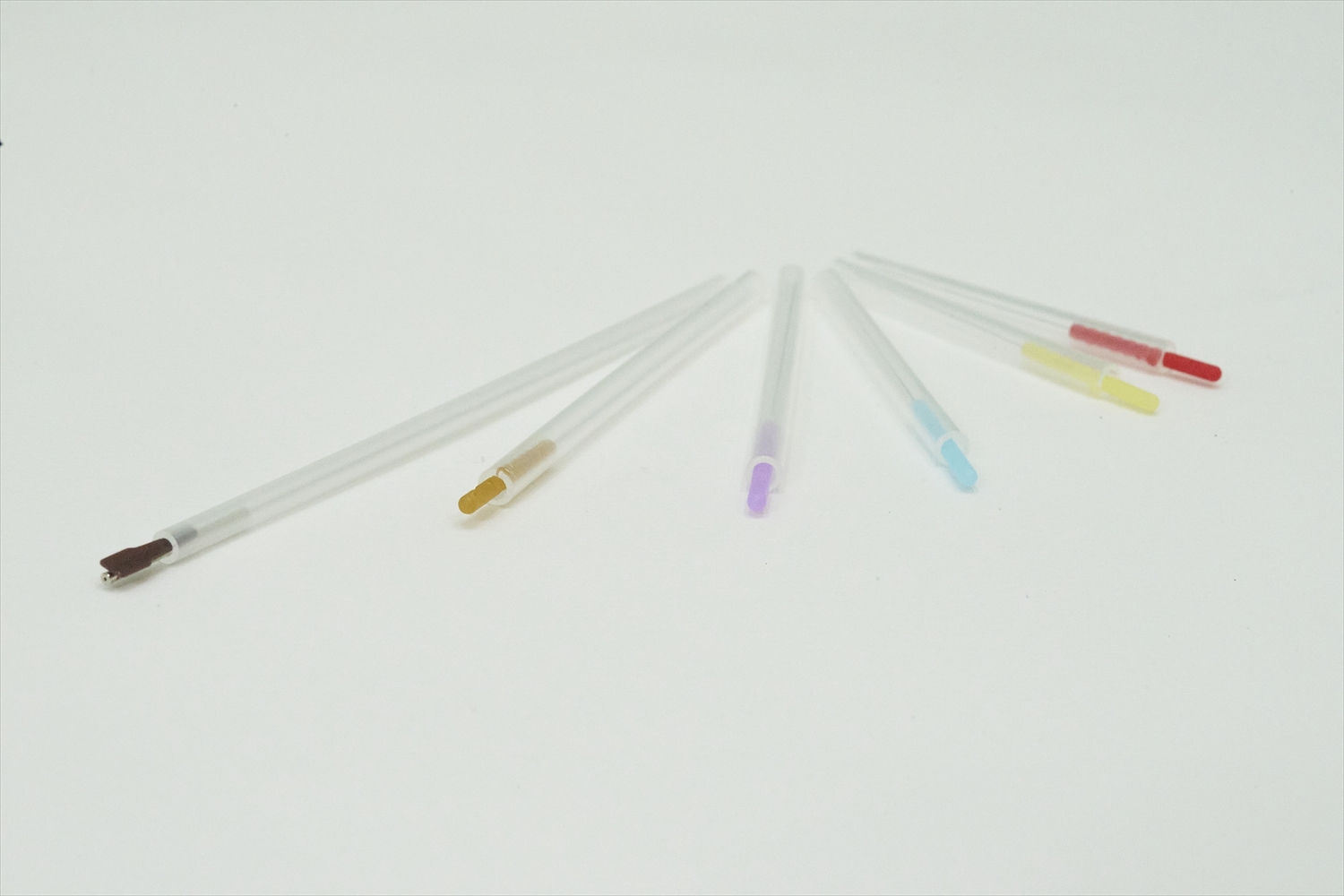 当院で使用している鍼は松葉型(円錐状)になっています。針は太さにより色が違います。線形0.16mm(赤)、0.18mm(黄)、0.20mm(青)、長さは30mmから50mmの鍼をよく使用します。鍼はすべてディスポーザブル(使い捨て)で、滅菌されパックされているので清潔です。