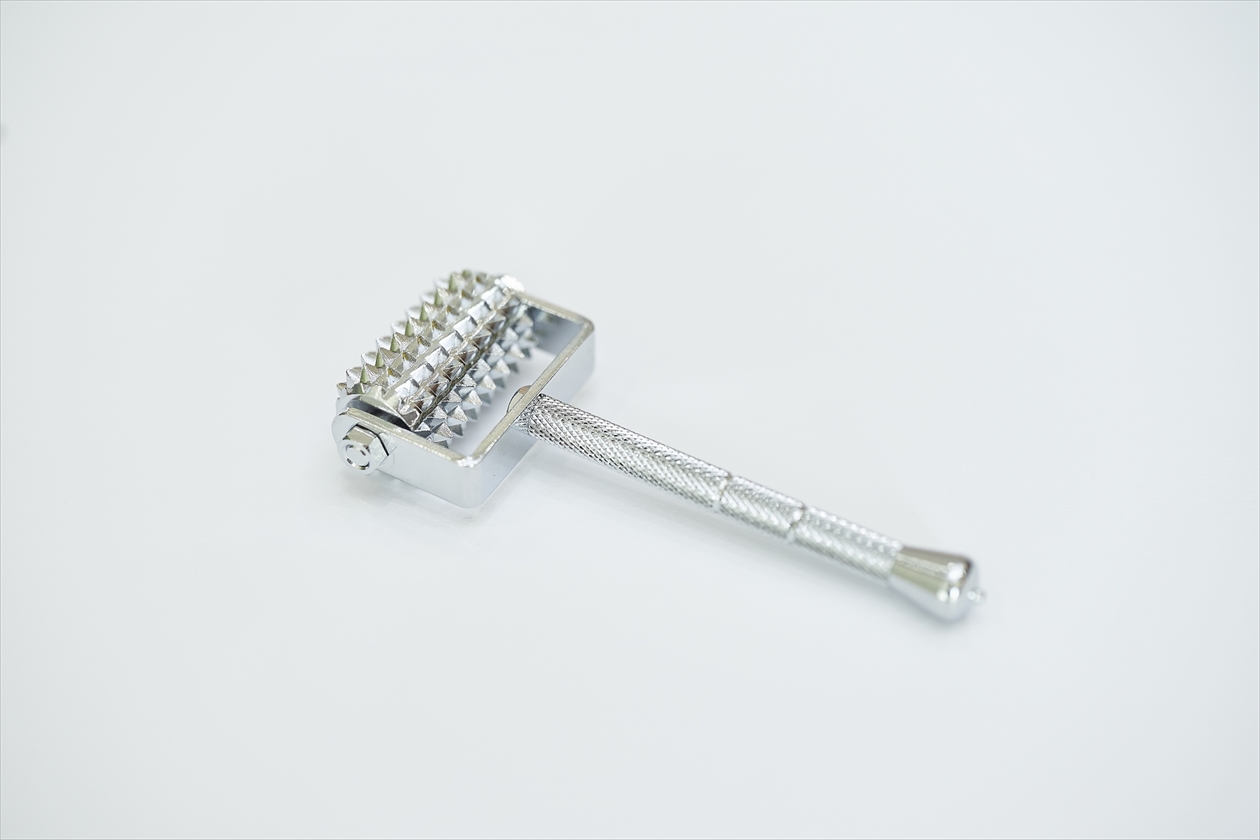 デコボコの鍼が回転する仕組みになっていて、肌の上をコロコロと転がすように使います。小児鍼などでよく使います。